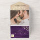 Fije el tono de su día especial con esta invitación de boda rústica de madera morada y luces de cuerda. Este diseño todo en uno, con detalles florales en oro y una foto en el personalizable en la parte trasera, ofrece un aspecto cohesivo y elegante para su celebración.  El rico fondo de madera morada y las brillantes lámparas de cuerda crean un ambiente romántico, perfecto para bodas rústicos, de granero o al aire libre. Personalizar con los detalles de su boda e información de RSVP para crear una primera impresión memorable para sus huéspedes. Importante: Esta invitación "todo en uno" requiere un sobre separado para el correo.
