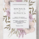 Sorprenda a sus invitados con esta elegante invitación de boda con hermosas flores y hojas con una tarjeta postal RSVP desmontable. Simplemente agregue los detalles de su evento en esta plantilla fácil de usar para convertirla en una invitación única.