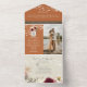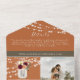 Celebra tu historia de amor con nuestra elegante invitación a una boda todo en uno inspirada en la caída, diseñada para capturar la belleza del romance contemporáneo. Esta impresionante invitación se caracteriza por una rica paleta de naranjas y borgoñas quemados, bellamente acentuados con flores de color boho acuarela en tarros de albañil, delicados pasto de pampas y el cálido y romántico resplandor de las luces de cuerda. Un monograma personalizado añade un toque de sofisticación, mientras que dos preciadas fotos de la pareja crean un verdadero aguijón. Perfecto para los bodas de otoño, esta invitación combina el encanto rústico con la elegancia moderna. Simplemente agregue sus fotos, detalles del boda e información de RSVP para obtener un toque personalizado que refleje su estilo único. Importante: Esta invitación "todo en uno" respetuosa con el medio ambiente requiere un sobre separado para el envío de correos.
