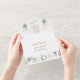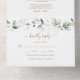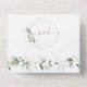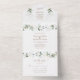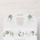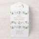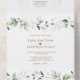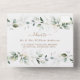 INVITACIÓN TODO EN UNO. Para pedidos al por mayor, debe eliminar los nombres y direcciones de los invitados. Diseño de tarjeta elegante con hojas y salpicaduras de verde ligero en acuarela, fuentes modernas, marco redondo de falso dorado con hojas, sobre fondo blanco. Utilice la herramienta Personalizar para agregar su información. Para artículos coincidentes, visite mi Colección Floral Verde Dorado.