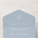 Plantilla única de Invitación Todo en una boda con tarjeta rsvp para una opción cómoda y de bajo costo para parejas con un presupuesto más ajustado. Esta simple invitación a la boda incluye su monograma en un círculo en la parte superior junto con los detalles de su boda sobre un polvoriento fondo azul. El color puede cambiarse en la herramienta de edición de diseño. Sus nombres están en una elegante letra manuscrita. El diseño clásico y tradicional hace que esta Invitación Todo en una boda sea ideal para un boda formal.