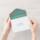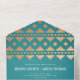En una invitación a un evento, se presenta un falso Relieve metalizado de bronce estilo azteca con una tipografía fácil de personalizar en un diseño simple y limpio, todo con un fondo azul turquesa sutilmente texturado. Personalice esta conveniente invitación con una postal de respuesta desgarradora cambiando el color de fondo para que se adapte a sus necesidades y cree una invitación de evento única con el momento del estilo de Southwestern Boho.