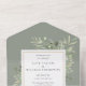 Todo en una invitación de boda con elegantes hojas de color agua botánica sobre un fondo verde sabio, un borde de marco dorado de moda y sus iniciales de monograma. La invitación incluye una tarjeta RSVP perforada que puede ser dirigida individualmente o dejada en blanco para que usted escriba a mano los detalles de la dirección de su invitado. Diseñado por Thisisnotme©