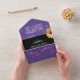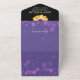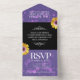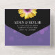 Haz que tu día especial sea una celebración inolvidable con estas invitaciones conmemorativas todo en uno. La elegante letra blanca con confeti lavanda púrpura y margaritas africanas doradas sobre fondos violetas púrpura y negros añaden un toque memorable. Personaliza como desees en la parte posterior y/o delantera.