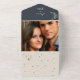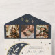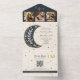 Celebre bajo las estrellas con esta elegante y celestial invitación a la boda todo en uno que presenta una romántica marina y un ilustracion de luna creciente de oro, brillantes acentos de estrellas y modernos detalles geométricos. El formato plegado único incluye detalles de RSVP, un código QR personalizado y ranuras de fotos para un toque personalizado. Perfecto para espectadores, amantes de la astrología o bodas de temática celeste. Este diseño es cómodo y elegante, ideal para celebraciones tipo boho, mística o inspiradas en el cielo nocturno. Por favor, tenga en cuenta que esta invitación "todo en uno" requiere un sobre separado para el envío de correo. Recomendamos emparejarlo con un sobre A9 estándar (5,75" x 8,75") para el mejor ajuste.