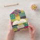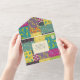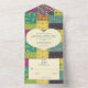 Un gráfico de forma cardíaca se coloca sobre un fondo de tejido de mosaico con retazos florales de estilo maximalista en una invitación de boda con tarjeta rsvp desmontable que tiene un aspecto cálido y colorido. Esta invitación es fácil de personalizar con todos los detalles de su evento.