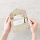 DISPONIBLE CON O SIN CÓDIGO QR O CON O SIN OPCIONES DE SELECCIÓN DE CENAS. Moderno y único, este diseño presenta un ramo de hierbas secas, flores y plantas de estilo boho en un suave fondo color tostado que ha estado angustiado con el oro del champán. Agregue un código QR a su invitación para que los visitantes puedan acceder rápidamente a su sitio Web boda para obtener detalles, direcciones, opciones de menú y más, o agregue la dirección URL Web del Registro de regalos. Las invitaciones todo en uno personalizadas son una combinación única de una invitación personalizado bien impresa y una postal RSVP fácil de desgarrar. ¡Y son tan fáciles de usar! Simplemente se pliega, después sella la solapa de atrás con los tres pegatinas claros incluidos y el correo. Y cuando sus invitados reciben la invitación de su personalizado, ¡simplemente sacan la tarjeta RSVP perforada y la envían de vuelta al correo!