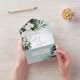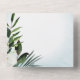 DISPONIBLE CON O SIN CENAS. TAMBIÉN ESTÁ DISPONIBLE CON UN CÓDIGO QR EN EL ÁREA RSVP. Este diseño presenta una hermosa y exuberante vegetación tropical y flores blancas sobre un suave fondo caribeño de color azul acuático. Perfecto para el destino o la boda en la playa. Creado por Simply Farmhouse Press.