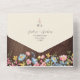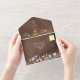 Celebre su boda con encanto rústico y romanticismo floral utilizando este sello todo en uno y envíe una invitación. Diseñado con ricas texturas de madera y coloridas flores silvestres de color acuático, cuenta con suaves flores rosadas, amarillas y azules que enmarcan los detalles del boda con gusto. RSVP y detalles incorporados: no se requieren sobres. Ideal para bodas de granero, montaña o primavera.