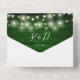 Todo en una invitación de boda con luces de cuerda de bonito, guirnaldas florales hechas a mano y tipografía de moda sobre un rústico fondo de paneles de madera verde esmeralda. La invitación incluye una tarjeta RSVP perforada con el código QR de su sitio web boda y detalles. Diseñado por Thisisnotme©