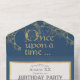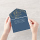 Esta encantadora y elegante invitación a una fiesta con un fondo de color azul marino y una temática de cuento de hadas imprimida en un diseño de purpurina dorado. En la parte superior aparece una banda de relojes desvanecidos. En la parte inferior aparece un castillo con un carro tirado por caballos a la derecha. El texto de arriba dice: "Había una vez..." para parecerse a un libro de cuentos de hadas, y está escrito con un elegante tipo de letra de diseño de purpurina dorado.