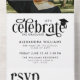 Invitación de graduación con todo en una foto con una pequeña gorra de graduación adornando la última e en celebrar. Invitación de graduación con tipografía moderna personalizada con una foto y el texto de su invitación en negro sobre un fondo blanco. Invitación de graduación en blanco con una foto y RSVP con un código QR.