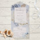 DISPONIBLE CON O SIN CÓDIGO QR O CON O SIN OPCIONES DE SELECCIÓN DE CENAS. El diseño está inspirado en la temática de la playa: corales polvorientos azules, tostadas, conchas crema y marrón, y peces estrella y vida marina sobre un suave fondo azul polvoriento que ha estado perturbado por el oro del champán. Agregue un código QR a su invitación para que los visitantes puedan acceder rápidamente a su sitio Web boda para obtener detalles, direcciones, opciones de menú y más, o agregue la dirección URL Web del Registro de regalos. Las invitaciones todo en uno personalizadas son una combinación única de una invitación personalizado bien impresa y una postal RSVP fácil de desgarrar. ¡Y son tan fáciles de usar! Simplemente se pliega, después sella la solapa de atrás con los tres pegatinas claros incluidos y el correo. Y cuando sus invitados reciben la invitación de su personalizado, ¡simplemente sacan la tarjeta RSVP perforada y la envían de vuelta al correo!
