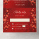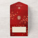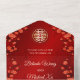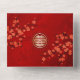 Esta invitación a la boda todo en uno presenta un diseño chino tradicional con flores de cerezo rojo y un símbolo de doble felicidad dorado sobre un fondo rojo brillante. Los nombres de novias y novias están escritos en un elegante y elegante guión.
