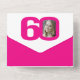 Plantilla de invitación de cumpleaños número 60 de gráfico simple y llamativo en rosa intenso, negro y blanco, todo en uno. Personaliza esta invitación de cumpleaños desmontable con los detalles de tu evento de fiesta de cumpleaños y hasta cuatro fotos diferentes de la cumpleañera. La invitación viene con una simple tarjeta de respuesta RSVP desmontable donde también puedes solicitar una canción para bailar o pedir cualquier requisito dietético o especial si es necesario. Tres círculos simples para tus fotos de ahora y de entonces y espacio para tu propia foto en el 0 de 60 en la solapa exterior que admite hasta 4 fotos diferentes para que las agregues. Otros colores y artículos coincidentes están disponibles. © Diseño original de Sarah Trett para www.mylittleeden.com en Zazzle.