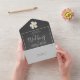 Un diseño sencillo y moderno con una flor simbólica, escritura blanca y un contorno blanco sobre gris oscuro. El reverso tiene todos los detalles del boda, personaliza la parte delantera y de vuelta a los detalles de su día especial. Una mirada clásica a un asunto formal. Estilo de coincidencia en Bridal Shower, RSVP, Save the Date y más. La flor hawaiana de Lei, Plumeria es un símbolo de "nuevos comienzos".