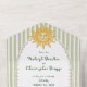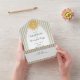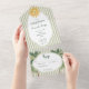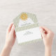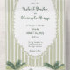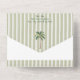 This whimsical coastal wedding all in one wedding invitation features a vintage sun motif, lace border, palm tree, and stylish sage green stripe background. Perfect for a beach or California destination wedding. Created by Simply Farmhouse Press.