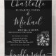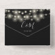 Toda en una invitación de boda con luces de cuerdas de bonito, tarros de albañil, nombres de estilo de firma y tipografía de moda en un fondo negro. La invitación incluye una tarjeta RSVP perforada con un código QR. Diseñado por Thisisnotme©