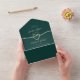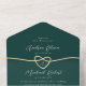Celebra tu amor con estilo con esta elegante invitación a una boda todo en uno con color verde esmeralda y oro. Este moderno diseño de sellado y envío presenta un corazón minimalista de cuerda dorada, una tipografía elegante y un rico fondo esmeralda. Incluye un código QR para un RSVP sencillo y los detalles de su sitio web boda personalizado. Perfecto para parejas que deseen una moda, una invitación ecológica y gratuita que impresiona a los huéspedes tanto por su belleza como por su comodidad.