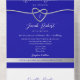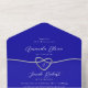 Elegante invitación de boda todo en uno en azul real con acentos purpurinas plateados. Cuenta con un detalle de corazón, código QR para un RSVP fácil y enlace al sitio web del boda. Perfecto para bodas glamorosas de invierno, este sello y diseño de envío no requiere de sobre. Una invitación moderna pero atemporal para las parejas que buscan brillo y sofisticación.