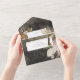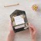 DISPONIBLE CON O SIN CÓDIGO QR O CON O SIN OPCIONES DE SELECCIÓN DE CENAS. Moderno y único, este diseño presenta un ramo de hierbas secas, flores y plantas de estilo boho sobre un suave fondo negro que ha estado angustiado con el oro del champán. Agregue un código QR a su invitación para que los visitantes puedan acceder rápidamente a su sitio Web boda para obtener detalles, direcciones, opciones de menú y más, o agregue la dirección URL Web del Registro de regalos. Las invitaciones todo en uno personalizadas son una combinación única de una invitación personalizado bien impresa y una postal RSVP fácil de desgarrar. ¡Y son tan fáciles de usar! Simplemente se pliega, después sella la solapa de atrás con los tres pegatinas claros incluidos y el correo. Y cuando sus invitados reciben la invitación de su personalizado, ¡simplemente sacan la tarjeta RSVP perforada y la envían de vuelta al correo!