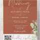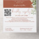 Invitación de boda de terracota todo en uno con vegetación botánica, luces de cadena y tipografía elegante. La invitación incluye una tarjeta de RSVP perforada con el código QR de su sitio web de boda y detalles. Diseñado por Thisisnotme©
