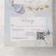 DISPONIBLE CON O SIN CÓDIGO QR O CON O SIN OPCIONES DE SELECCIÓN DE CENAS. El diseño está inspirado en la temática de la playa: corales polvorientos azules, tostadas, conchas crema y marrón, y peces estrella y vida marina sobre un suave fondo azul polvoriento que ha estado perturbado por el oro del champán. Agregue un código QR a su invitación para que los visitantes puedan acceder rápidamente a su sitio Web boda para obtener detalles, direcciones, opciones de menú y más, o agregue la dirección URL Web del Registro de regalos. Las invitaciones todo en uno personalizadas son una combinación única de una invitación personalizado bien impresa y una postal RSVP fácil de desgarrar. ¡Y son tan fáciles de usar! Simplemente se pliega, después sella la solapa de atrás con los tres pegatinas claros incluidos y el correo. Y cuando sus invitados reciben la invitación de su personalizado, ¡simplemente sacan la tarjeta RSVP perforada y la envían de vuelta al correo!