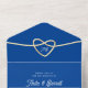 Presentamos nuestra elegante invitación a la boda todo en uno en azul real. Con un corazón de cuerda dorada refinada, que cubre las iniciales de los monogramas de la novia y el novio, esta invitación exuda sofisticación moderna. Mejorado con un sencillo guión de caligrafía y una imagen personalizado de la pareja en la parte de atrás, captura la esencia de tu historia de amor. Administre RSVP sin problemas y proporcione información adicional a través de nuestro sitio web incluido y código QR. Únete a nosotros para celebrar el amor y la unidad con estilo.