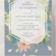 Elegantes hortensias blancas y verdes, rosas rosados y crema, mareas y vegetación sobre un polvoriento fondo azul, estas invitaciones triples a la boda presentan sus detalles en secciones con letras de moda y un código QR a su sitio web boda para responder. MÁS estilos, colores y elementos coincidentes en nuestra tienda.