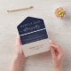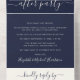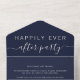 Elegante anuncio de fuga o boda privada y invitación a la recepción de boda en azul marino oscuro y crema claro. "Happily Ever After Party" está escrito con una mezcla de tipografía simple y una elegante letra con florituras. Ingrese la URL del sitio web de su boda para crear un código QR para que sus invitados respondan en línea y obtengan información sobre alojamiento, direcciones, fiestas de la noche anterior y otros detalles. Una tarjeta postal de respuesta desprendible proporciona una respuesta conveniente sin sobre para sus invitados que prefieren responder por correo.