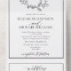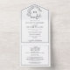 Invitación Todo En Uno Código QR Escudo blanco negro Leafy Monograma Boda