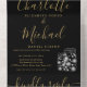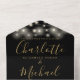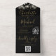 Toda en una invitación a la boda con luces de cuerdas de bonito, tarros de albañil, nombres de estilo característicos y tipografía de oro de moda en un fondo negro. La invitación incluye una tarjeta RSVP perforada con un código QR. Diseñado por Thisisnotme©