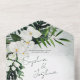 DISPONIBLE CON O SIN OPCIONES PARA CENAR EN LUGAR DE UN CÓDIGO QR. Este diseño presenta una hermosa vegetación tropical exuberante y flores blancas sobre un suave fondo de color verde. Perfecto para el destino o la boda en la playa. Creado por Simply Farmhouse Press.