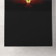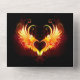 Ángel dispara el corazón con las alas flameantes sobre fondo negro.