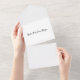 Todas las invitaciones personalizadas All-In-One de One Wedding Invite son una combinación única de una invitación personalizado bien impresa con una postal RSVP fácil de desgarrar. ¡Y son tan fáciles de usar! Simplemente se pliega, después sella la solapa de atrás con los tres pegatinas claros incluidos y el correo. Cuando sus invitados reciben la invitación de su personalizado, ¡simplemente sacan la tarjeta RSVP perforada y la envían de vuelta al correo! Dimensiones: 5,6" L x 4,5" H plegado, 5,6" L x 12,125" H desplegado Fácil de separar 5,6" L x 4,25" H tarjeta postal perforada RSVP; calificada tamaño postal USPS No se necesita sobre envío - sello y envío Dos reservas de tarjetas de papel de alta calidad para elegir entre dos opciones de impresión disponibles: Estándar y Alta Definición Incluye tres pegatinas redondos para sellar cerrados