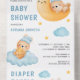 Sorprenda a sus huéspedes con esta elegante ducha de bebé, que incluye un adorable conejo de bebé y una moderna tipografía con una tarjeta de raffile de pañales desmontable. Simplemente agregue los detalles de su evento en esta plantilla fácil de usar para convertirla en una invitación única.
