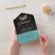 Fiesta de cumpleaños de bonito Quinceañera, todo en una invitación, hecho en un patrón negro sobre damasco negro, en el interior, con una libélula pastel bonito, en la parte superior. El exterior está decorado con un damasco acuático. Personalice el texto del personalizado para su día especial de chica favorito.