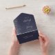 The left-hand edge of this elegant modern all-in-one wedding invitation and RSVP features a silver faux glitter border. The customizable text combines silver gray whimsical handwriting, copperplate and italic fonts on a dark blue background. The return address appears on the outside flap and the reverse side of the detachable RSVP card in silver gray text on solid dark blue. A QR code is included on the RSVP card for guests who would prefer to reply online.