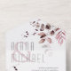 Delicados arreglos folclóricos con pequeños acentos florales en tonos suaves y oníricos de crema, taupe y rosa con salpicaduras de purpurina burdeos y diseños únicos hacen de este una interesante colección, especialmente para bodas de otoño. La cómoda invitación a la boda combinada y la postal RSVP que se muestra aquí presentan frondosos bordes fológicos en la cara frontal y una franja de color burdeos profundo y acuarela en la parte posterior. Vea el vínculo de colección en esta página para ver todos los elementos coincidentes de este hermoso diseño o busque ID817 para ver otras piezas y opciones de color para este conjunto.