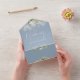 Todo en una invitación a la boda con luces de cuerda de bonito, vegetación floral botánica y tipografía elegante sobre un polvoriento fondo azul. La invitación incluye una tarjeta RSVP perforada con un código QR. Diseñado por Thisisnotme©