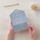 Todo en una invitación a la boda con los nombres de los padres, hojas rústicas de vegetación botánica y tipografía elegante sobre un polvoriento fondo azul. La invitación incluye una tarjeta RSVP perforada con un código QR. Diseñado por Thisisnotme©