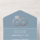 Un monograma moderno recibe el brillo con anillos de boda rosa entrelazados y texto fácil de personalizar, haciendo de esto una nueva invitación clásica a la boda con texto simplificado en blanco y sonrojado sobre un suave fondo azul polvoriento. Edite todo el texto de este presupuesto de fácil acceso todo en una sola invitación para una invitación personalizado, sencilla y clásica que soportará la prueba del tiempo.