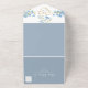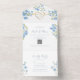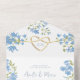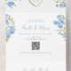 Moderno, elegante, boho floral, periwinkle polvoriento invitación de boda todo en uno azul con código QR, corazón de cuerda dorada y monograma.
