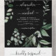 Invitaciones sobre fondo blanco de la Boda Primaria de la Madera Verde Esmeralda y Eucalipto Verde y Negro - incluye tipografía de escritura hermosa y elegante con hojas botánicas modernas y vegetación para la celebración especial del Día de la Boda.