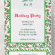 Una plantilla editable de invitación para fiestas de vacaciones todo en uno con letras de guión y espacio para la información de tu fiesta sobre un patrón rústico de fondo de hueso verde con bayas rojas.