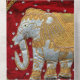Imagen de un elefante indio decorado con lentejuelas y cuentas en blanco, plata y oro contra el terciopelo rojo marrón.