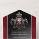 Una hermosa y majestuosa invitación a la primavera con un lujoso escudo real coronado con una corona que tiene elefantes indios a ambos lados y un tercero en el escudo mismo. Están enmarcadas por una entrada negra bordeada por bandas verticales de imitación plateada que se colocan junto a un fondo rojo de vino de Borgoña. Las plantillas de texto en blanco para la redacción personalizado aparecen en ambos lados. El tercio inferior tiene una tarjeta de respuesta desgarradora con dirección rsvp personalizada para que sus invitados la completen. Son ideales para bodas, compromisos, aniversarios, duchas de novias y fiestas de cumpleaños de hindi, hindú, sanatani dharma y bodas asiáticos étnicos. Simplemente cambie la redacción para adaptarla a su evento o ocasión especial.