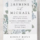Elegantes invitaciones florales para bodas todo en uno, con detalles bodas enmarcados con polvorientas rosas azules y blancas, hortensias, y exuberantes hojas y vegetación de eucalipto. Personalice la polvorienta invitación floral al matrimonio todo en uno con los detalles de su boda para un diseño perfecto para su boda de primavera o verano. Diseñado para coordinar con nuestra colección de bodas Elegante Dusty Floral.