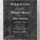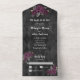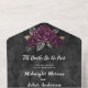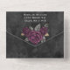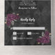 Oscuro todo en una invitación de boda con tarjeta RSVP despegable. ¿El dicho hasta la muerte nos hace parte y se burla de rosas morados oscuros con un fondo de patrón diamantífero negro? Tipografía de guiones.