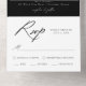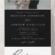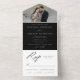 Elegante invitación de boda "todo en uno" con tu foto de compromiso en la parte superior de la invitación. Sus nombres y detalles bodas se muestran en letras blancas clásicas con acentos modernos de escritura caligráfica a lo largo de todo el diseño con un fondo negro. La foto de la invitación a la boda todo en uno incluye una tarjeta RSVP desmontable que puede enviarse por correo como postal. Diseñado para coordinar con nuestra colección de bodas de caligrafía elegante en blanco y negro.
